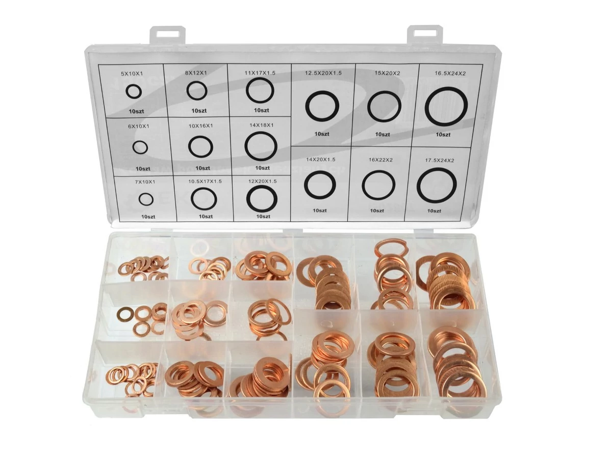 - A legelterjedtebb méreteket tartalmazó réz alátét készlet, praktikus műanyag tárolóban, melyben mindig minden a helyén lehet így Ön könnyedén megtalálja a szükséges méretű réz alátétet javítás, karbantartás közben.