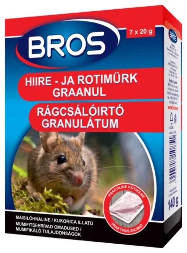 BROS rágcsálóirtó granulátum szemcséi mérete, keménysége, különleges ízvilága vonzóvá teszi a terméket a rágcsálók számára. Innovatív, külön tasakokban található a méreganyag, emiatt fokozottan biztonságosnak mondható. A tasakos kiszerelés elejét veszi a kiszóródásnak, korlátozza a gyerekek, házi kedvencek hozzáférését a méreganyaghoz, valamint korlátozza a méreganyag illatanyagának elillanását, a külső eredetű szagokkal történő keveredését. Tovább tart a vonzó hatása.