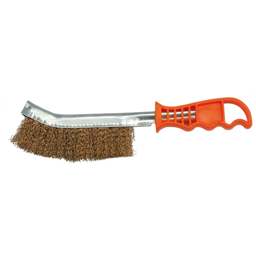 Fém nyéllel keretezett hullámos sárgaréz huzalból készült Kézi kefe műanyag nyéllel Mindenhol ajánlott, ahol az acélkefe használata megkarcolhatja a megtisztított anyagot.