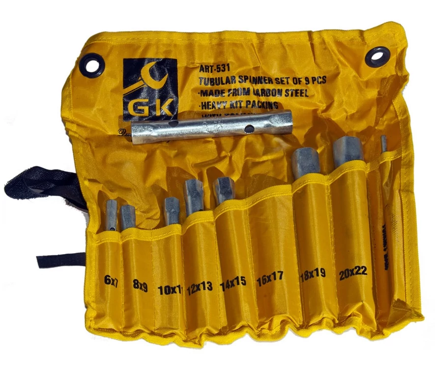 Csőkulcs készlet, 9 darabos. Alkalmas nehezen hozzáférhető, mélyen ülő 6-lapos csavaranyák be és kihajtásához. A furatba hajtószárat helyezve a be és kihajtás könnyebbé válhat.