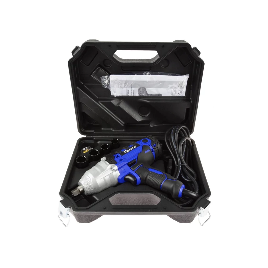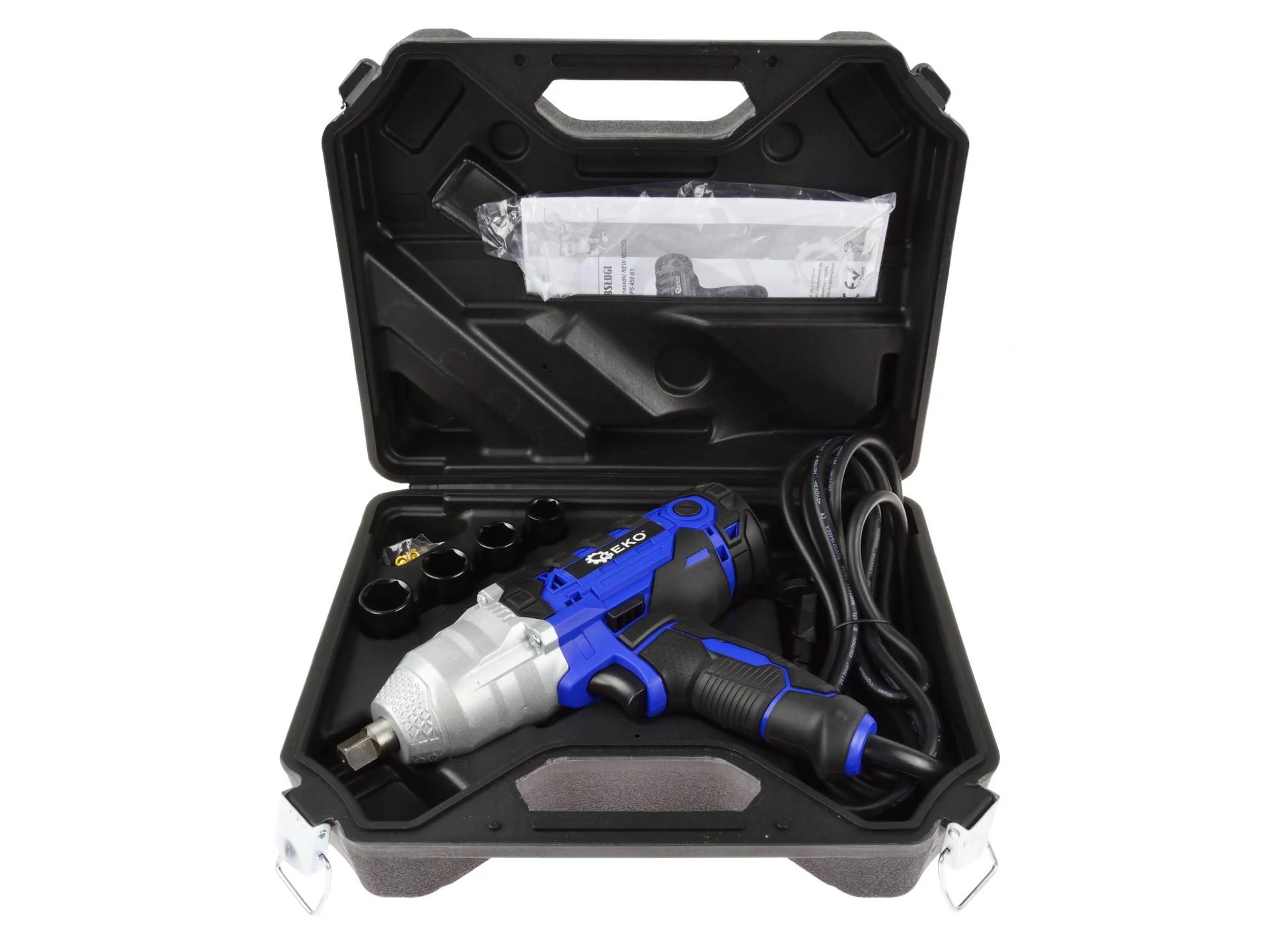 Geko 450W-os, 1/2″ elektromos ütvecsavarozó CrV 17, 19, 21, 22 mm-es dugókulcsokkal. A csavarozó magas, 720 Nm-es nyomatékkal és akár 3600 fordulat/perc sebességgel rendelkezik. Elektromos árammal működik, így nincs szükség kompresszorra. Kiválóan alkalmas autószerelő műhelyekben és otthoni garázsokban való használatra.