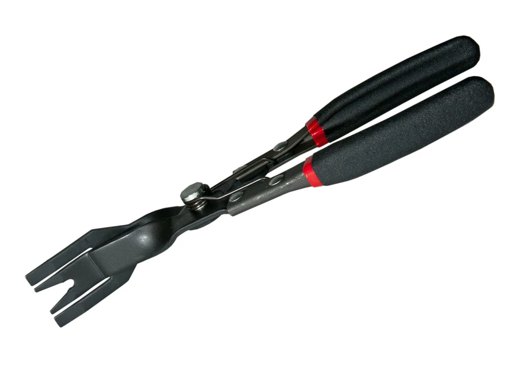 Rugós szerkezetű fogó a patentek, kapcsok, ajtóburkolatok, logók, stb. sérülésmentes eltávolításához. Könnyen használható akár szűk helyeken is, például lökhárító burkolatnál. Széles villái segítenek elkerülni a panelek törését vagy szakadását a rögzítések eltávolításakor. Csúszásmentes markolattal.