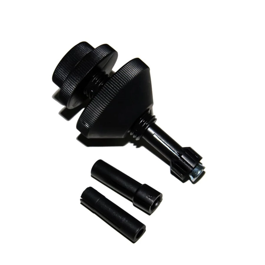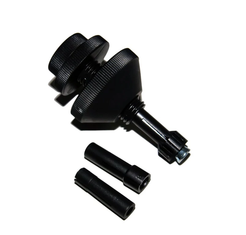 - Összeszerelés: A legalsó kicsi hajtókorongot tekerje le a központi menetes szárról. Cserélje ki az adaptert a tengelykapcsolónak megfelelő méretűre, majd szerelje össze.