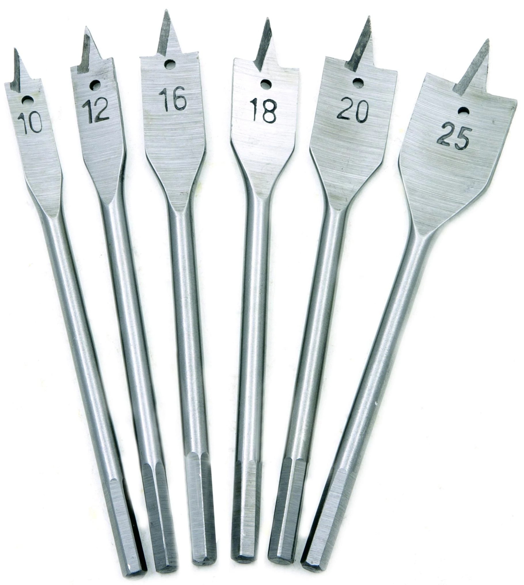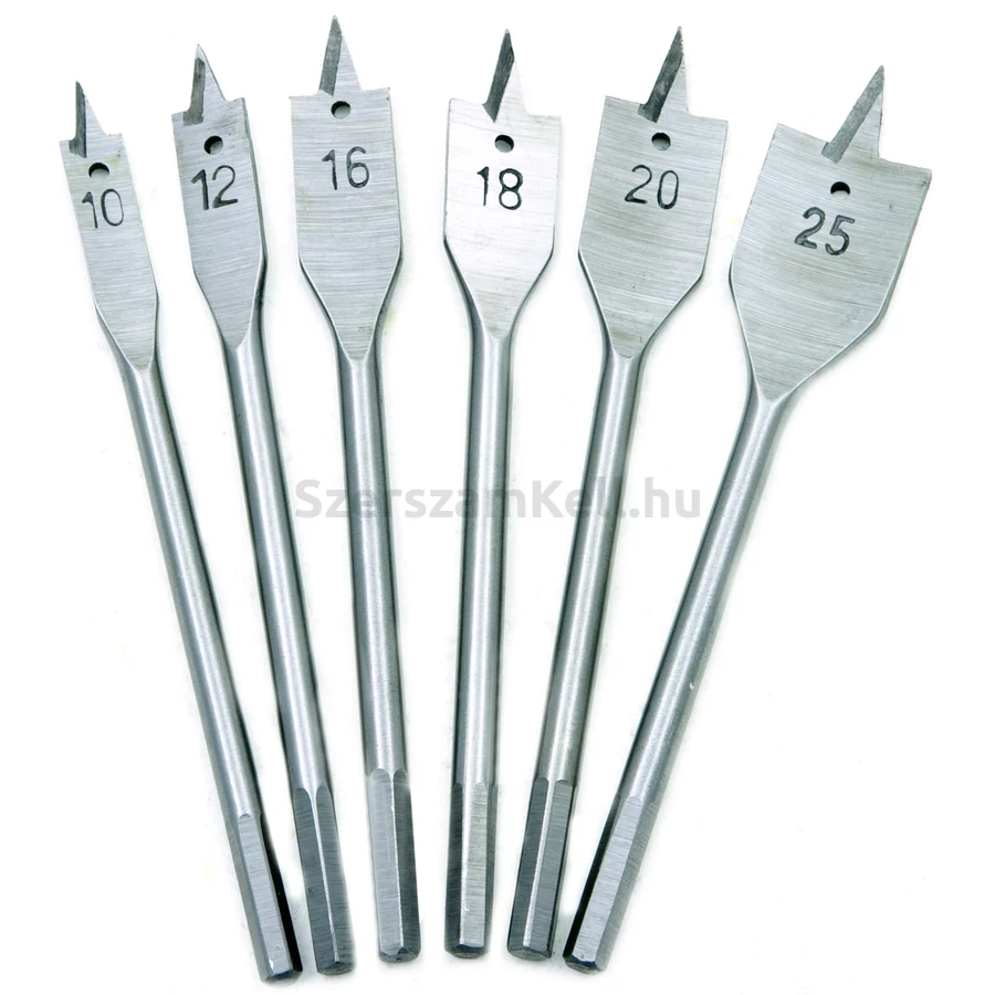 6 db-os ásófúró készlet fához. A készlet 10, 12, 16, 18, 20, 25 mm átmérőjű fúrókat tartalmaz.
