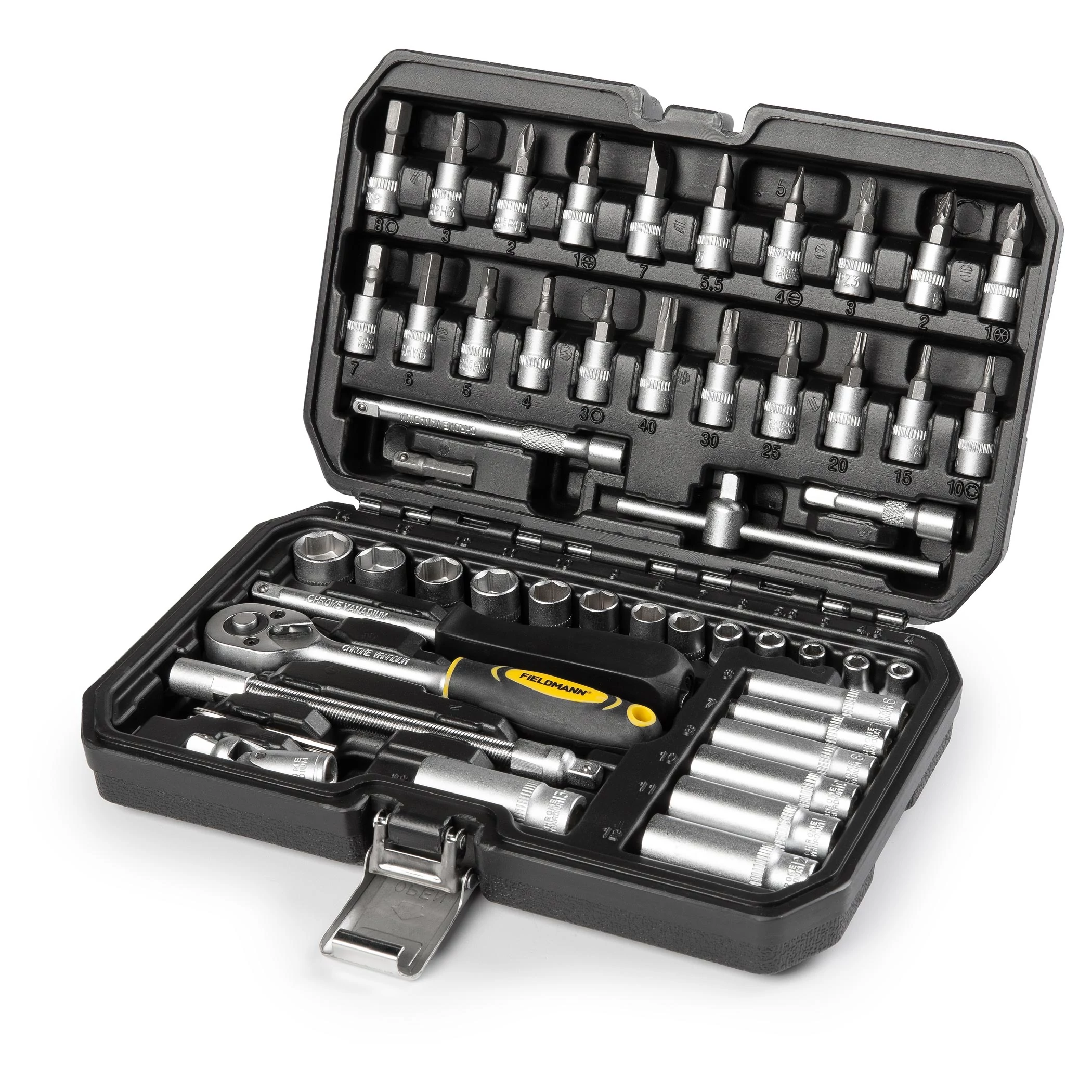 A Fieldmann FDG 5020-53R szerszámkészlet 53 részből áll - 1/4” racsnis kulccsal, 4 - 40 mm fejekkel, CR-V minőségű anyagból. A készlet tartalmaz továbbá diagonális és hosszabbító hajtószárat, valamint csőfogókat, de megtalálható benne imbuszkulcs és csavarhúzó készlet is. Az eszközök ergonomikus tervezésűek, egyoldali fogantyúval ellátott műanyag táskában érkeznek. Az egyoldali fogantyú elhelyezés biztosítja, hogy a táska csak a megfelelő oldalon nyitható, így a készlet tartalma nem hullik ki a nyitás során.