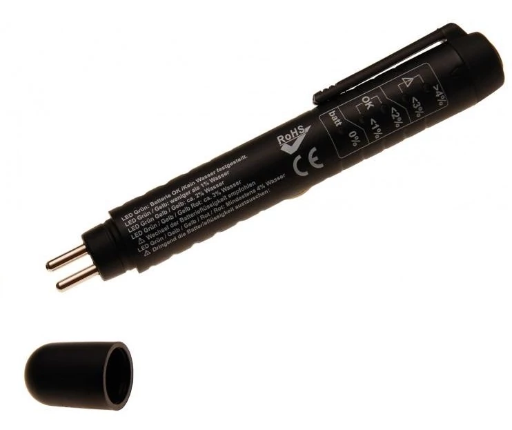 - Pontos és megbízható folyadék teszter, az ellenőrzés eredményét 4 LED segítségével jelzi, a szenzorokat védőkupak takarja. 1,5V AAA elemmel működik (mellékelve).