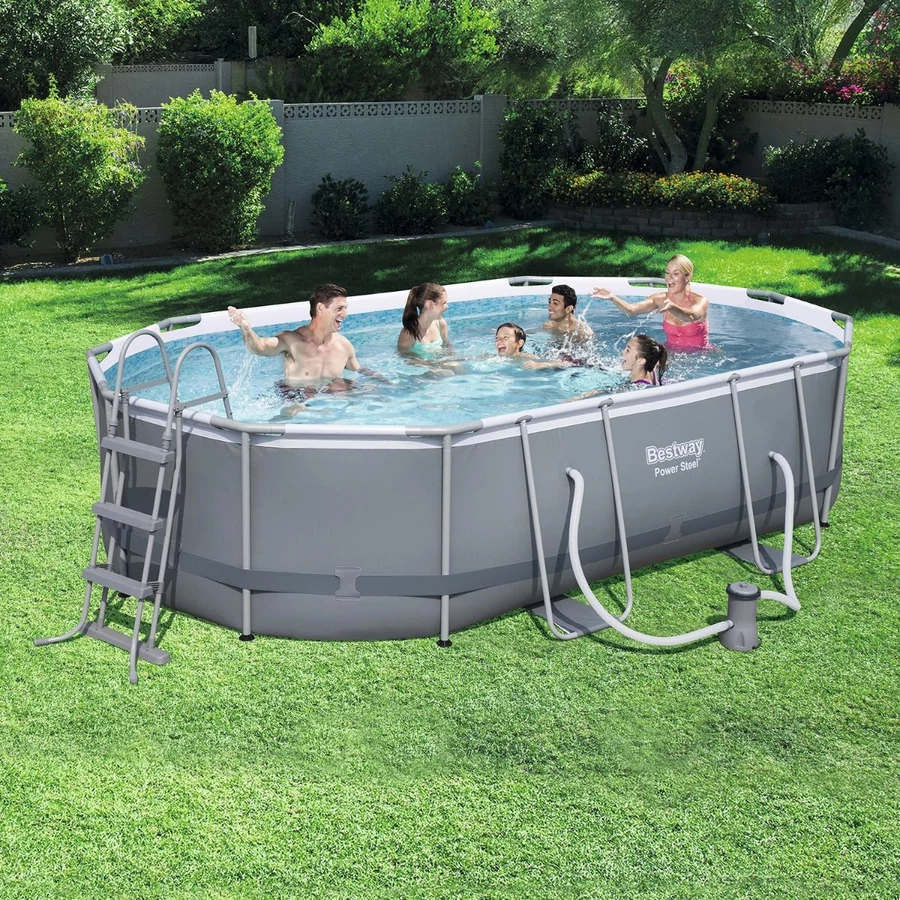 Az erős medence testet egy csőváz szerkezet tartja. Egyszerűen felállítható, színterezett acélvázas medence, extra erős újfejlesztésű PVC testtel.