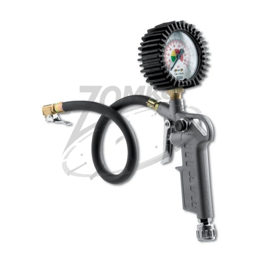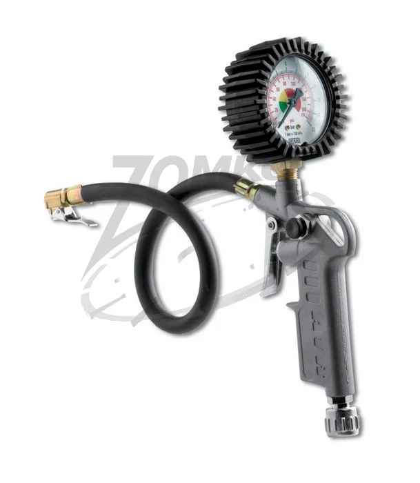 • Keréktömlő fúvató pisztoly, aluminium öntvényházas, 63mm átmérőjű törés elleni védelemmel ellátott manométerrel, nagyméretű, érzékeny működtetőkarral és leeresztőszeleppel, 40cm hosszú szövetes gumi tömlővel, kerékszelep gyorscsatlakozóval.