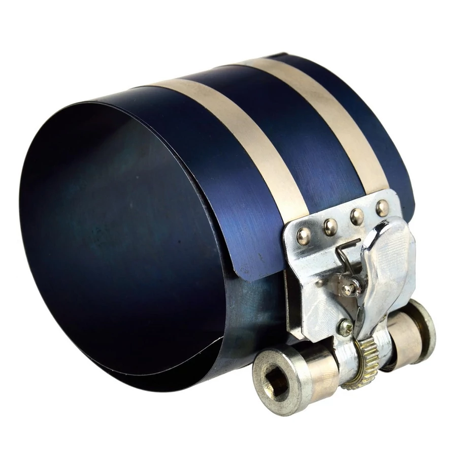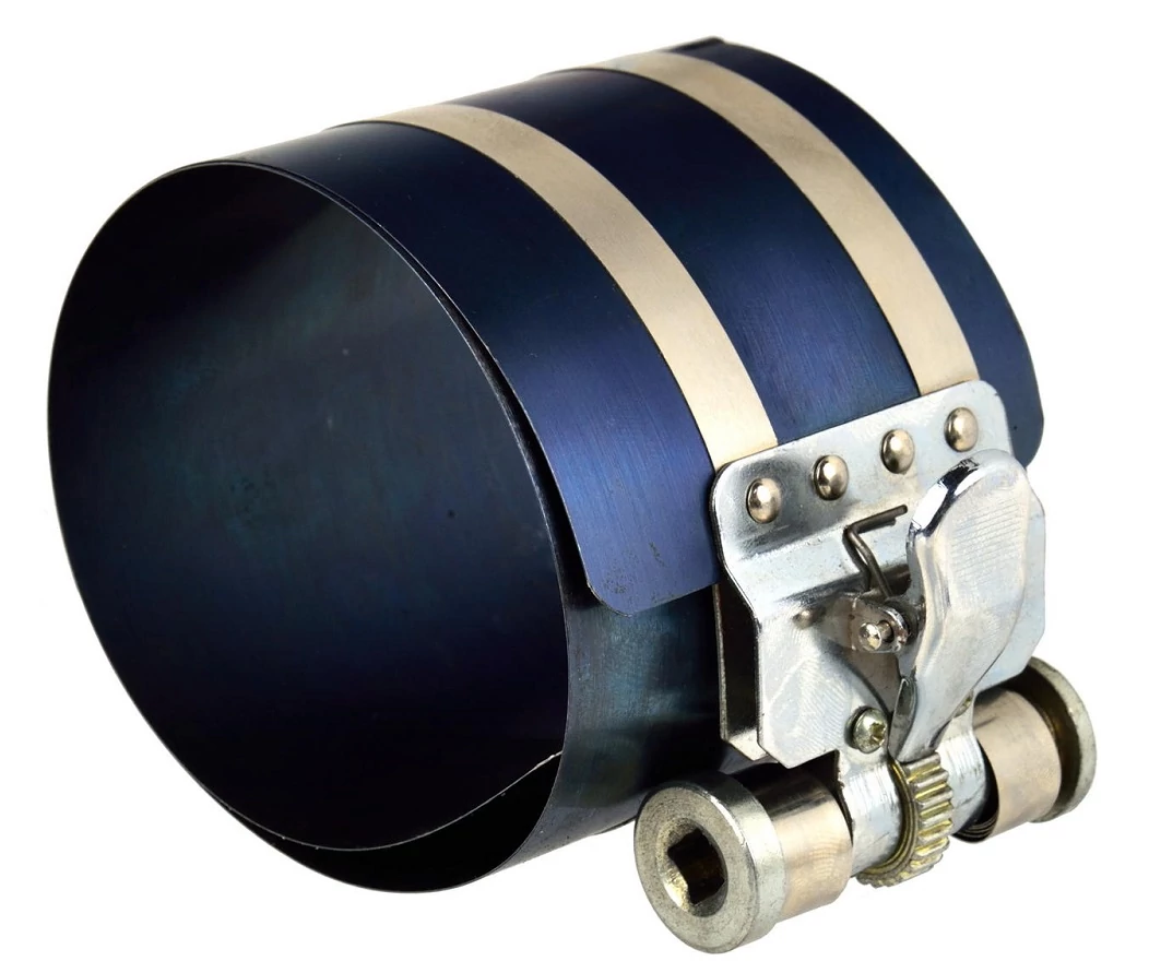 - Dugattyúgyűrű összehúzó. Minőségi konstrukció rugalmas acélból és racsnis szorító mechanizmussal.