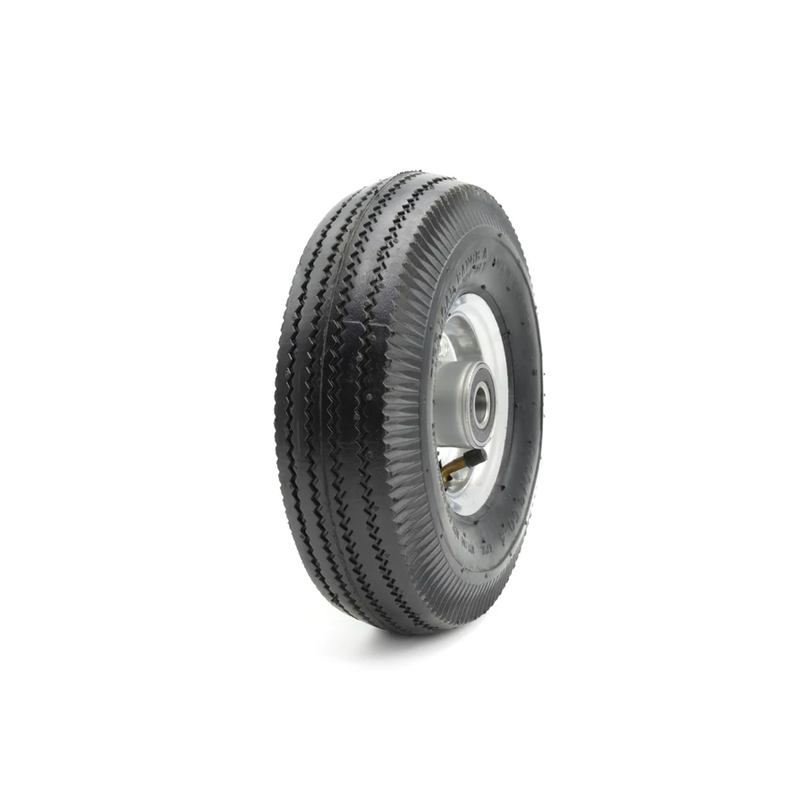 Kézi kocsikerék 280mm 4.10/3.5-4 Pneumatikus . Alkalmas a legtöbb kézi teherautóhoz és kerti kocsihoz. A kerék 4,10/3,5-4, 280 mm magas x 80 mm széles, és 20 mm-es furattal (tengelyfurattal) rendelkezik.