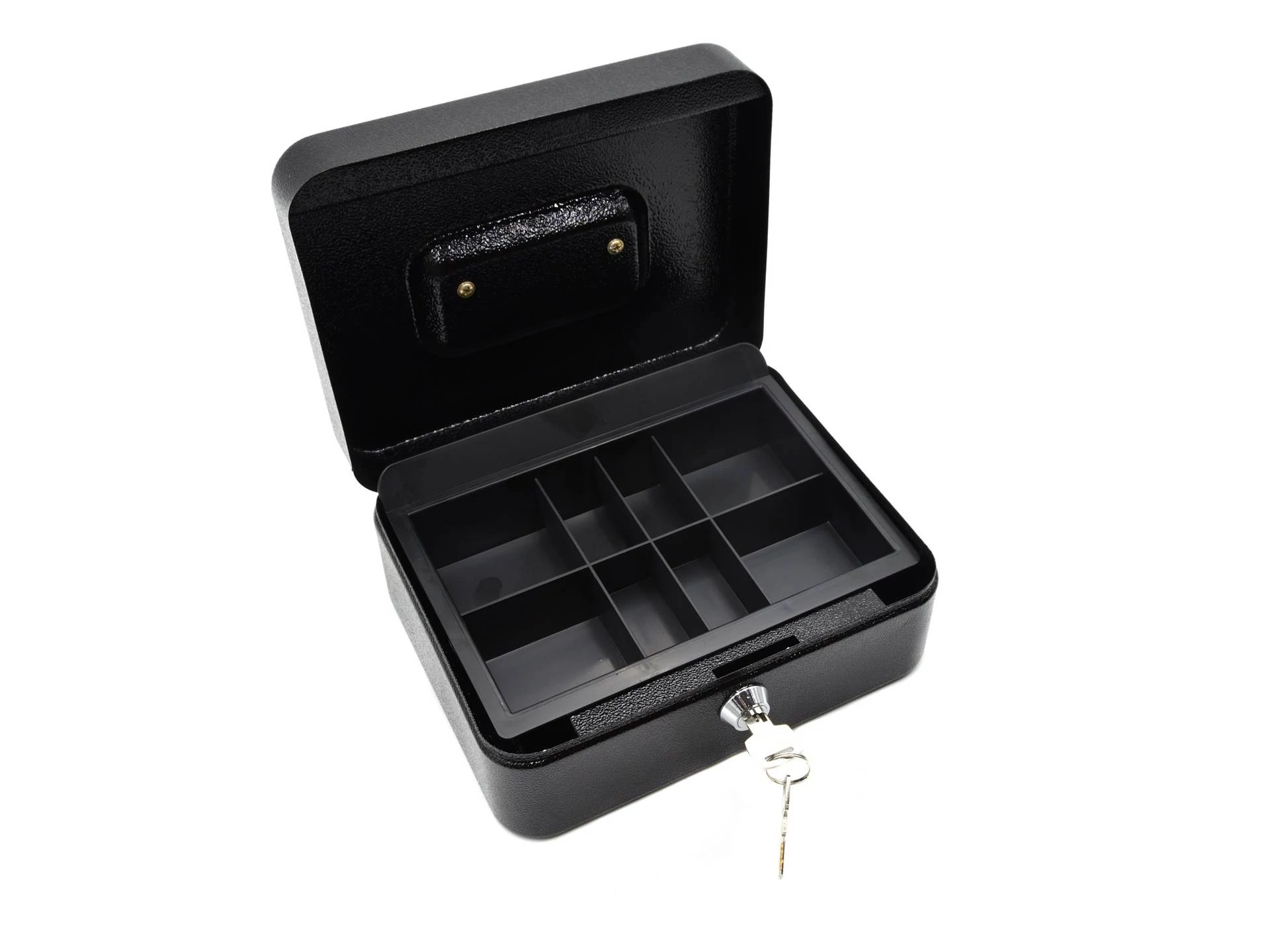Hordozó fogantyúval felszerelt. Műanyag betét belsejében rekeszekkel: