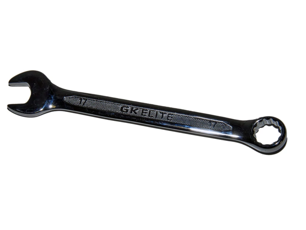 Csillag-villáskulcs. Recézett, dombornyomásos markolat a csúszásmentes fogásért. Egyenes-szárú, mindkét vége 15°-kal hajlított (villás vége horizontálisan, csillag vége vertikálisan). Teljes felülete fényesre polírozott.