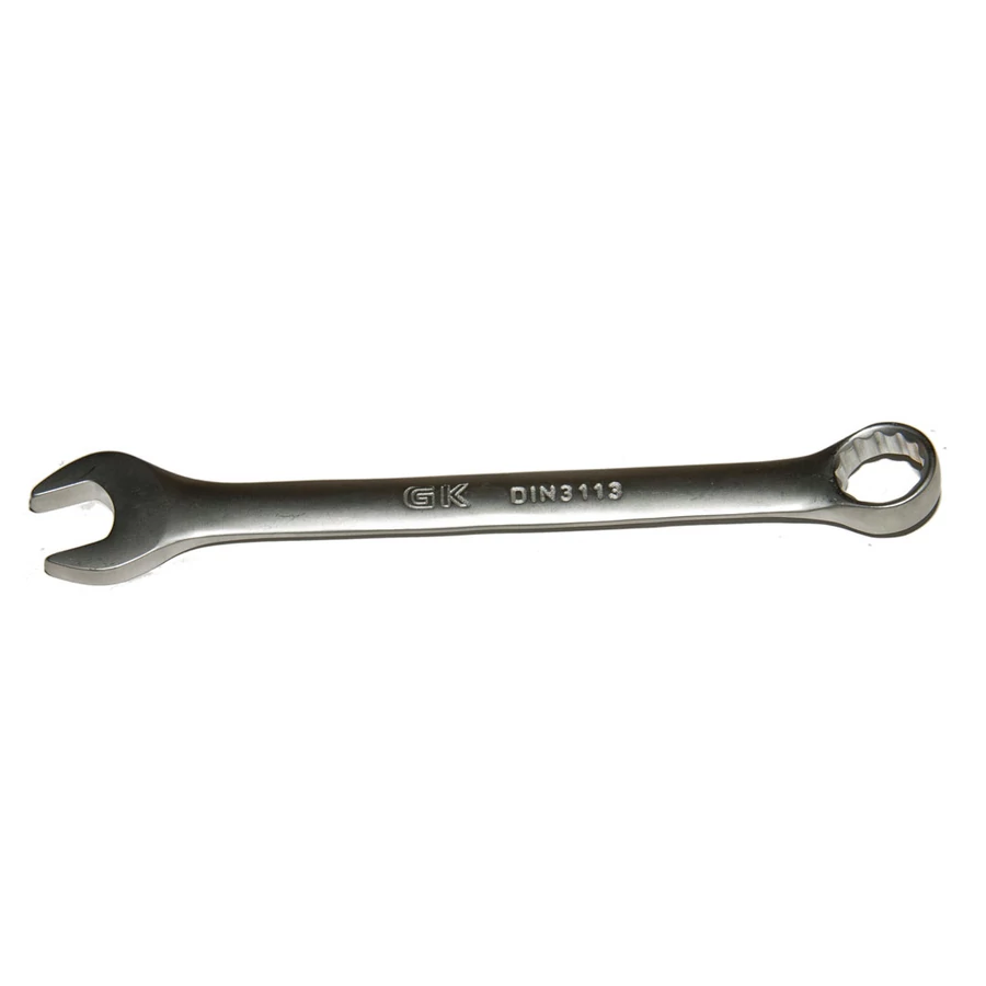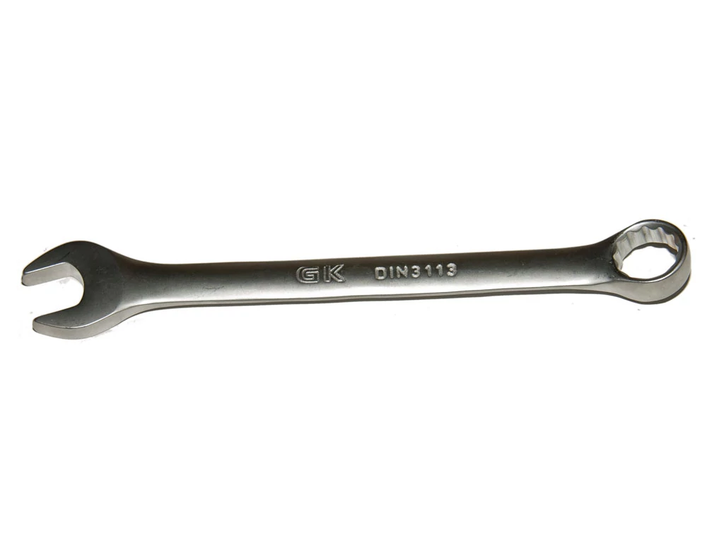 Csillag-villáskulcs. Egyenes-szárú, mindkét vége 15°-kal hajlított. Markolata sima felületű. Teljes felülete polírozott, matt fényezésű.