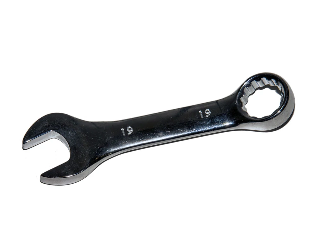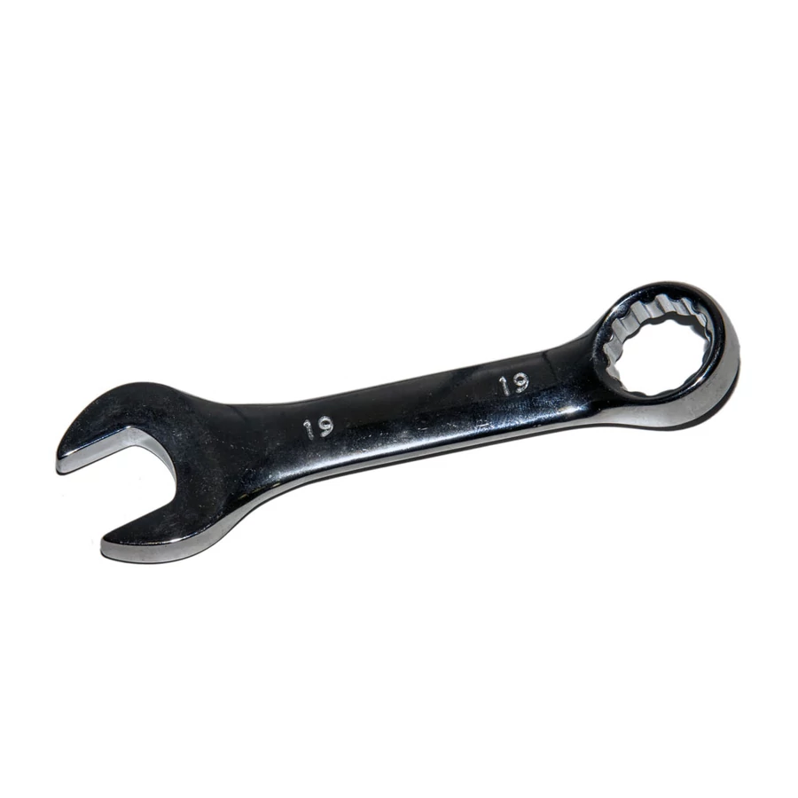 Csillag-villáskulcs, Rövid kivitel. Egyenes-szárú, mindkét vége 15°-kal hajlított (villás vége horizontálisan, csillag vége vertikálisan). Markolata sima felületű. Teljes felülete fényesre polírozott.