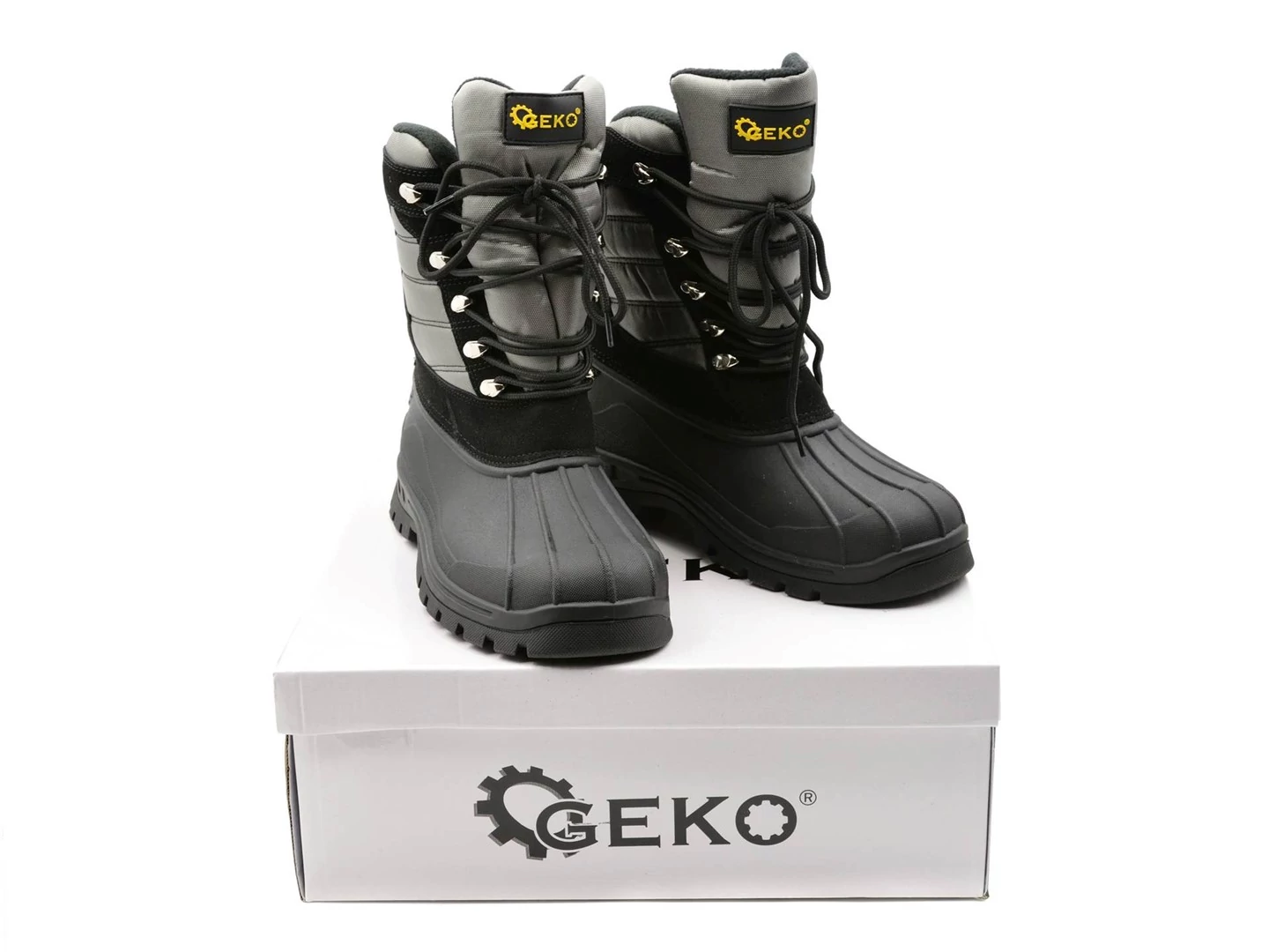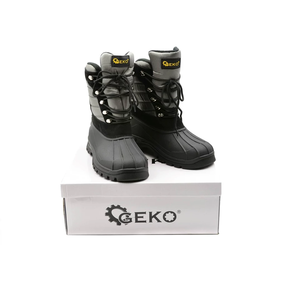 Vízálló hócsizma a neves GEKO márkától. A felsőrész alsó része és a talprész kiváló minőségű termogumiból készült, nagyon jó tapadás jellemzi, és a nagy rugalmasságnak köszönhetően nem korlátozza a mozgást és nem jelent ellenállást hajlításkor. A felsőrész felső része vízálló poliészter anyagból, nylonból, poliuretánból és velúrból készült. A vastag, szigetelt, kötött szőrméből készült cipőbélés kiváló védelmet nyújt nagyon alacsony hőmérsékletekkel szemben. A horgos fűzőrendszer biztosítja a cipő tökéletes illeszkedését a vádlihoz.