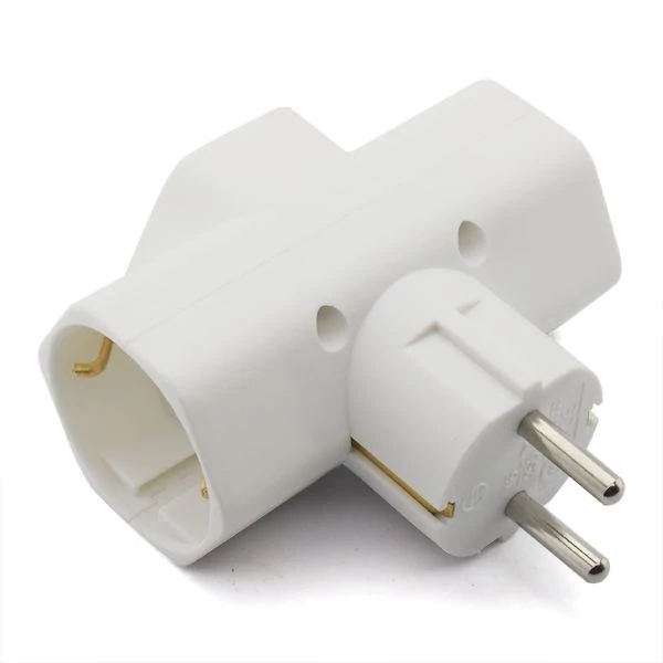 230V-os, normál szabvány földelt hálózati T elosztó háztartási felhasználásra, fehér színben. Alkalmas háztartási elektromos berendezésekhez a villamosáram szétosztására. Aljzatba dugva két fogyasztót tudunk üzemeltetni egy aljzatról.
