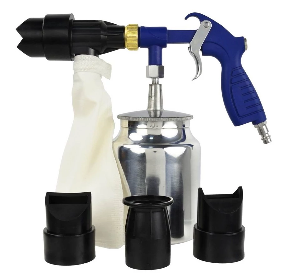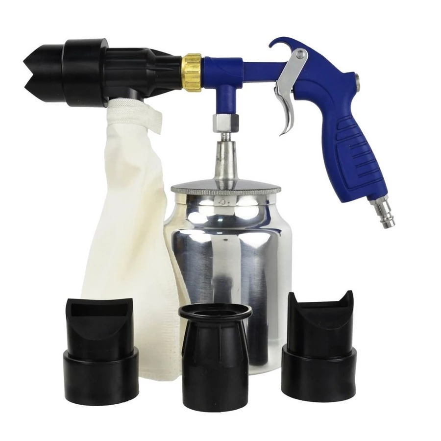 A pisztoly lehetővé teszi a csiszolóanyag visszanyerését egy szövetzsákba, ha a pisztolyfejet a homokfúvott elemhez nyomja.