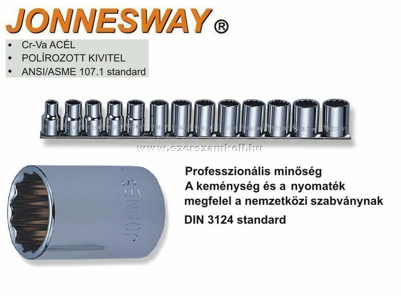 A coll , inch méretezésű vagy más néves SAE dugókulcsok az angolszász területeken elterjedt méretezés, főként Amerikában és Angliában. Ez a dugókulcs készlet tartalmazza a legfontosabb inch méretű csavarokhoz való dugókulcsokat. Alkalmas amerikai autókhoz, vagy olyan gépekhez melyek onnan érkeztek. Esetenként a japánban összeszerelt gépekben is alkalmazzák az inch méretezésű csavarokat. A befogása normál, szabványos 1/2"-os. Bármilyen itt kapható fix vagy racsnis hajtókarral megfogható. A Jonnesway 30 éves múltra visszatekintő professzionális szerszámokat gyártó vállalat. Termékeit mindennapos szervizipari felhasználásra ajánlott strapabíró alapanyagból készültek, mérettartóak. Görgessen lejjebb, nézze meg a lenti "Termék videó" fülön található összeállítást! Minden Jonnesway termékre törés garanciát vállalunk, mely rendeltetés szerű használat mellett vagy anyaghibából eredő törött szerszám cseréjét jelenti. Ezek a dugókulcsok légkulcshoz nem használhatóak, csak kézi szereléshez