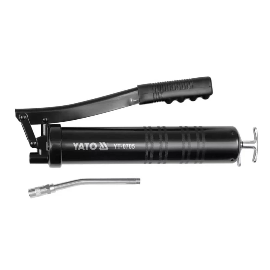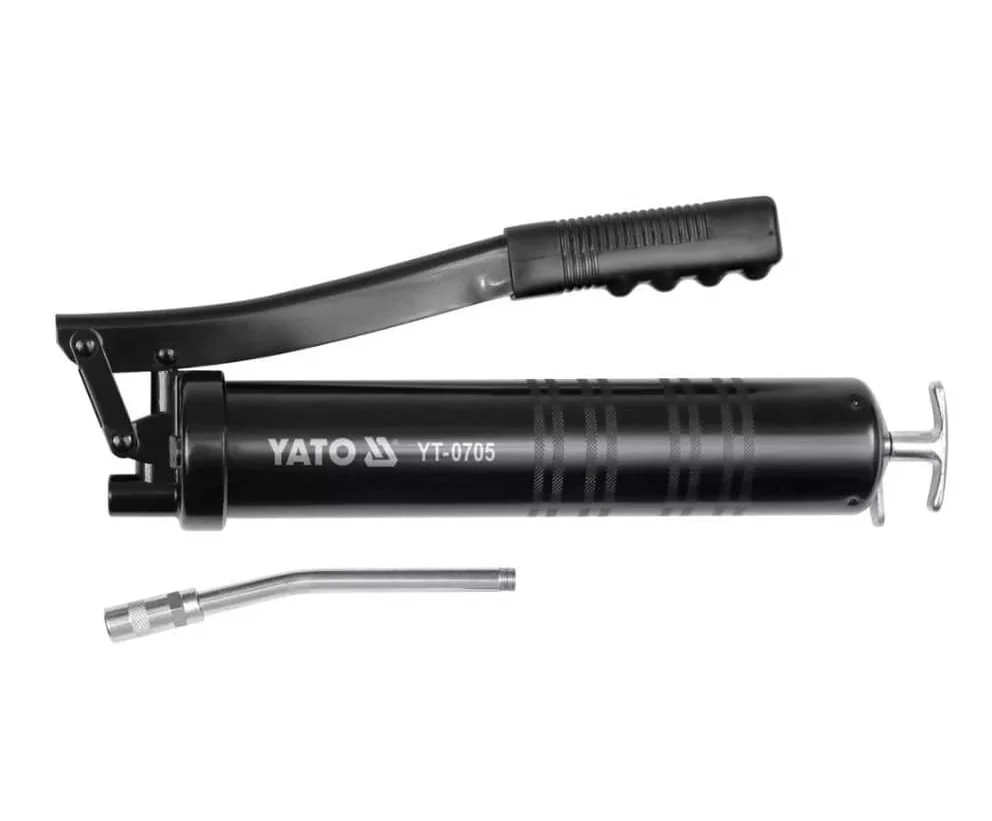 A Yato zsírpisztoly mechanikai elemek, például tengelyek, csapok, csapágyak és ízületek nagynyomású kenésére szolgáló eszköz. 400 ml-es acélhengerből készül, kézi működtetésű dugattyúval. A dugattyú kiváló minőségű gumiból készült tömítéssel rendelkezik, amely ellenáll a zsírok és olajok hosszú távú működésének. Minden tömítés és szelep a legnagyobb pontossággal készül, és lehetővé teszi a 70 MPa nyomású munkavégzést. A zsírzópisztolynak van egy szelepe, amely megakadályozza a kenőanyag szabad kifolyását, valamint egy rendszer a dugattyú alatti tér légtelenítésére. A zsírzópisztoly feje alumíniumból készült.