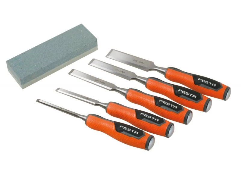 - FESTA vésőkészlet 5 db-os kiszerelés egy darab fenőkővel és ergonomikus műanyag nyéllel, feltűnő felülettel.