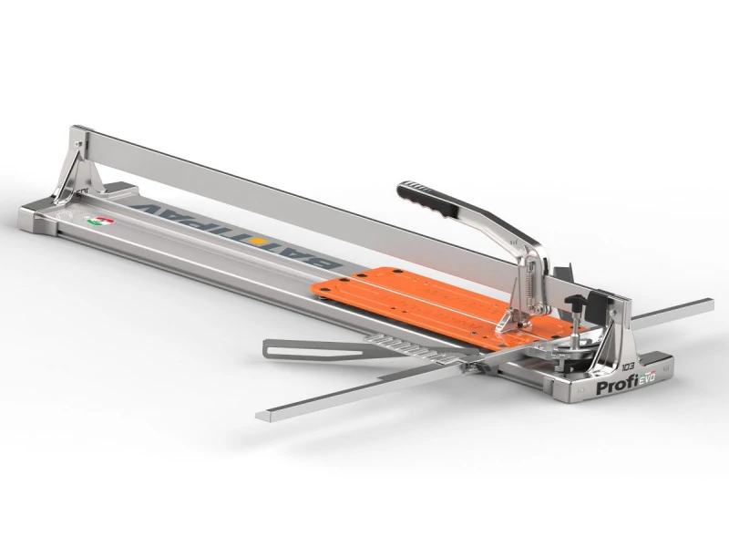 Precíz, igényes és gyors munkákhoz érdemes BATTIPAV kézi csempevágót használni. Olasz, prémium minőségű gyártmány, a vágógépek egyik vezető és legprofibb márkájától. Segítségével a legnagyobb csempe- vagy burkolólapokat is könnyen lehet, pontos méretre és tetszőleges átló mentén vágni. Az 1030 mm-es vágáshosszúságú vágógéppel a 72 cm-es lapok átlós vagy ferde szögű darabolása sem okozhat gondot. Egy nagyon masszív, állítható fémvonalzóval és a rajta elhelyezkedő szögbeállítóval van felszerelve, mely egy szerkezeti elemből van kialakítva. Nagy előnye, hogy a vonalzón tetszés szerint tolható a goniometrikus négyzet. A vonalzó mindkét irányban elforgatható: -45°– 0° – +45°. A vágást egy stabil acél vezetősín mentén egy két golyóscsapággyal ellátott tolókar/vágókar végzi. Ennek a jól csúsztatható, mozgatható tolókarnak a lenyúló végén található a vágókerék, amely tartós fém ötvözetből készül. A 4 darab speciális rugóval alátámasztott munkalap tökéletesen idomul és szintben tartja a csempelapot, hogy mindig megfelelő legyen a felfekvése a pontos vágáshoz. A hosszú, oldalsó támasztók is tovább növelik a csempevágó stabilitását és biztonságossá teszik a nagyméretű csempelapok vágást.