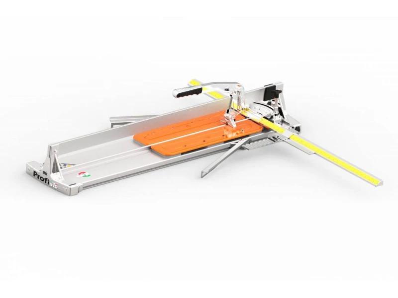 A közkedvelt PROFI ALU továbbfejlesztett változata 1330 mm vágási hosszal. Precíz, igényes és gyors munkákhoz érdemes BATTIPAV kézi csempevágót használni. Olasz, prémium minőségű gyártmány, a vágógépek egyik vezető és legprofibb márkájától. Segítségével a legnagyobb csempe- vagy burkolólapokat is könnyen lehet, pontos méretre és tetszőleges átló mentén vágni. Az 1330 mm-es vágáshosszúságú vágógéppel a 90 cm-es lapok átlós vagy ferde szögű darabolása sem okozhat gondot. Egy nagyon masszív, állítható fémvonalzóval és a rajta elhelyezkedő szögbeállítóval van felszerelve, mely egy szerkezeti elemből van kialakítva. Nagy előnye, hogy a vonalzón tetszés szerint tolható a goniometrikus négyzet. Ez mindig segíti a felhasználót a pontos méret beállításában és közvetlen leolvasásában, mert a csempe a vonalzóval egy szintben marad. Ráadásul segíti a csempe megtámasztását, hogy az vágás közben teljesen fix helyzetben maradjon, átlós helyzetben is. A vonalzó mindkét irányban elforgatható: -45°– 0° – +45°. A vágást egy stabil acél vezetősín mentén egy két golyóscsapággyal ellátott tolókar/vágókar végzi. Ennek a jól csúsztatható, mozgatható tolókarnak a lenyúló végén található a vágókerék, amely tartós fém ötvözetből készül. A vágókerék mögött egy alumínium törőlap helyezkedik el, amely a bekarcolt lapokat egy határozott nyomással könnyen ketté töri. A törőlap alja fehér gumival van ellátva a csempe sérülésének kiküszöbölése miatt és biztosan nem hagy nyomot rajta. Ami egyedi teszi az EVO-t a piacon, az a törőlap mágnesezettsége, amely lehetővé teszi a bemetszést és kettéválasztást, egyetlen mozdulattal és egy kézzel. A 4 darab speciális rugóval alátámasztott munkalap tökéletesen idomul és szintben tartja a csempelapot, hogy mindig megfelelő legyen a felfekvése a pontos vágáshoz.