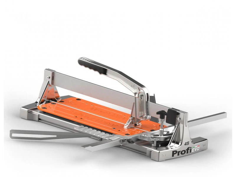 A közkedvelt PROFI ALU továbbfejlesztett változata 450 mm vágási hosszal. Precíz, igényes és gyors munkákhoz érdemes BATTIPAV kézi csempevágót használni. Olasz, prémium minőségű gyártmány, a vágógépek egyik vezető és legprofibb márkájától. Segítségével a legnagyobb csempe- vagy burkolólapokat is könnyen lehet, pontos méretre és tetszőleges átló mentén vágni. A 450 mm-es vágáshosszúságú vágógéppel a 32 cm-es lapok átlós vagy ferde szögű darabolása sem okozhat gondot. Egy nagyon masszív, állítható fémvonalzóval és a rajta elhelyezkedő szögbeállítóval van felszerelve, mely egy szerkezeti elemből van kialakítva. Nagy előnye, hogy a vonalzón tetszés szerint tolható a goniometrikus négyzet. Ez mindig segíti a felhasználót a pontos méret beállításában és közvetlen leolvasásában, mert a csempe a vonalzóval egy szintben marad. A vonalzó mindkét irányban elforgatható: -45°– 0° – +45°. A vágást egy stabil acél vezetősín mentén egy két golyóscsapággyal ellátott tolókar/vágókar végzi. Ennek a jól csúsztatható, mozgatható tolókarnak a lenyúló végén található a vágókerék, amely tartós fém ötvözetből készül. A vágókerék mögött pedig az alumínium törőlap helyezkedik el, amely a bekarcolt lapokat egy határozott nyomással könnyen ketté töri. A törőlap alja fehér gumival van ellátva a csempe sérülésének kiküszöbölése miatt és biztosan nem hagy nyomot rajta. Ami egyedi teszi az EVO-t a piacon, az a törőlap mágnesezettsége, amely lehetővé teszi a bemetszést és kettéválasztást, egyetlen mozdulattal és egy kézzel. A 4 darab speciális rugóval alátámasztott munkalap tökéletesen idomul és szintben tartja a csempelapot, hogy mindig megfelelő legyen a felfekvése a pontos vágáshoz.