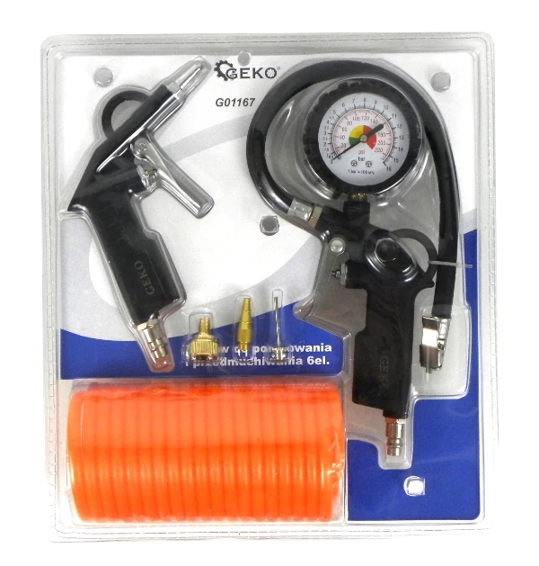 A nyomásmérővel ellátott pneumatikus gumiabroncs-felfújó pisztoly minden garázsban szükséges eszköz. A fegyver kényelmes, könnyű, praktikus és esztétikus. A pisztoly légtelenítő szeleppel és gumi nyomásmérő burkolattal rendelkezik.
