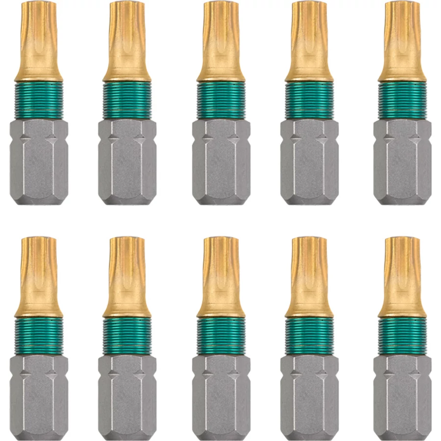 A kwb titán bitek különösen alkalmasak soros csavaros csatlakozásokhoz. Titán -nitridált TQ 60 acélból készült. Ez a felületkezelés, amelyben a titán és a TQ 60 acél tartós kötést képez, növeli az acél szilárdságát és garantálja az átlagon felüli élettartamot a legnagyobb állandó terhelés mellett. A rendkívül kemény titán felület a torziós zónával és a Mega Grip bordákkal kombinálva körülbelül 600%-kal növeli a szerszám élettartamát. Színes azonosító gyűrűkkel a fejforma megkülönböztetéséhez. 1/4 "C 6,3 tengely.
