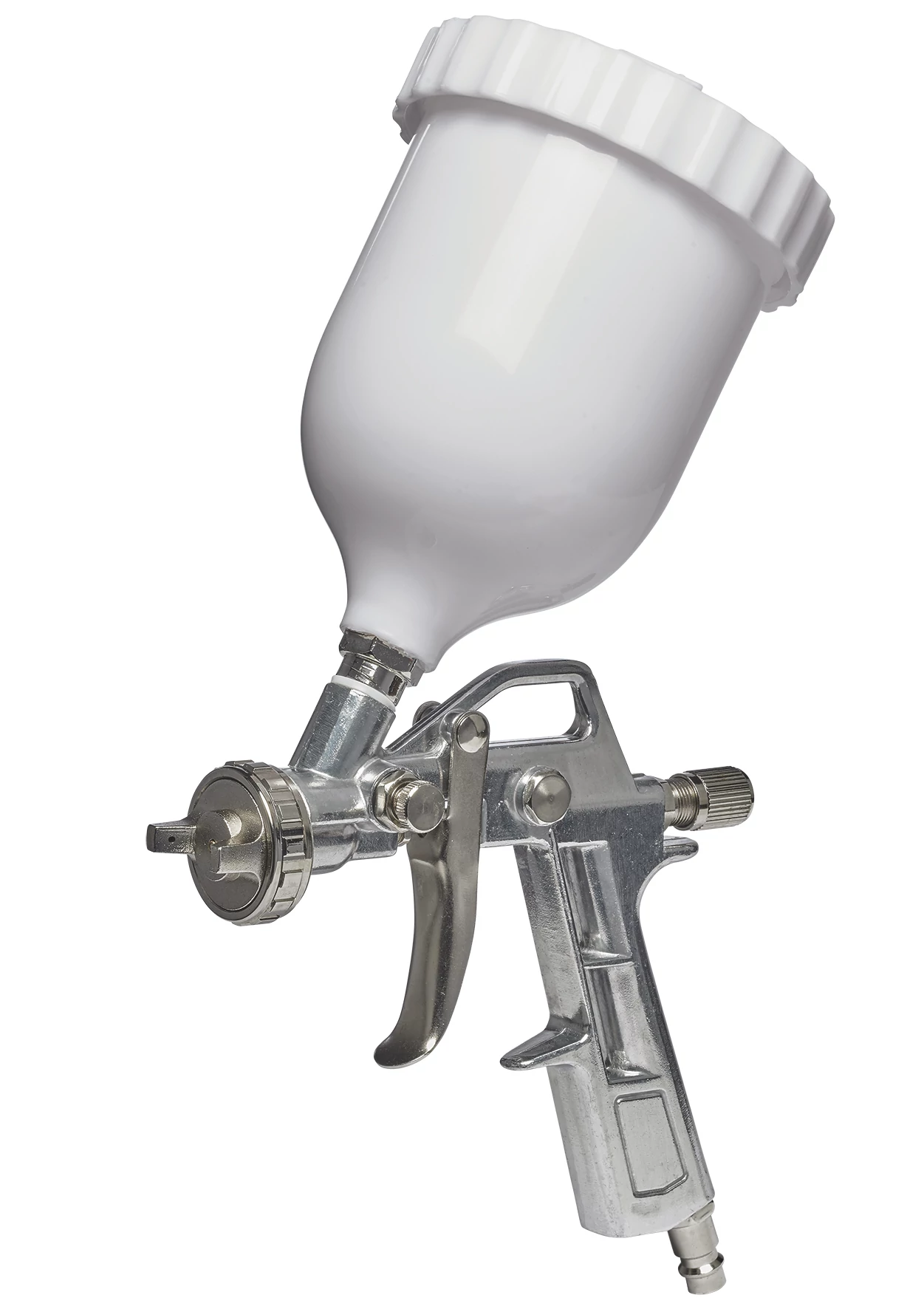 A szórótartállyal ellátott festékszóró pisztoly egy rendkívül sokoldalú szerszám, amely nagyban megkönnyíti a festékek és lakkok felvitelét a ház körüli, valamint a műhelyben és garázsban végzett munkák során. A szórótartályt használva egyenletesen hordhat fel lakkokat és nagy viszkozitású anyagokat. Az állítható (pont vagy széles) sugár segítségével mindig az elvégzendő munka és felület tulajdonságaihoz állíthatja a szórásképet. A szórófejet egyetlen kézmozdulattal elforgatva vízszintes helyzetbe állíthatja a függőleges sugarat. A szórásmennyiség a festékmennyiség-szabályozásnak köszönhetően finoman szabályozható. A nagy méretű, 0,6 liter űrtartalmú tartály lehetővé teszi, hogy nagyobb felületeken is huzamosabb ideig, megszakítások nélkül dolgozzon. A gyorscsatlakozó aljzathoz szükséges levegőcsatlakozó-szelepet megtalálja a gyári csomagolásban.