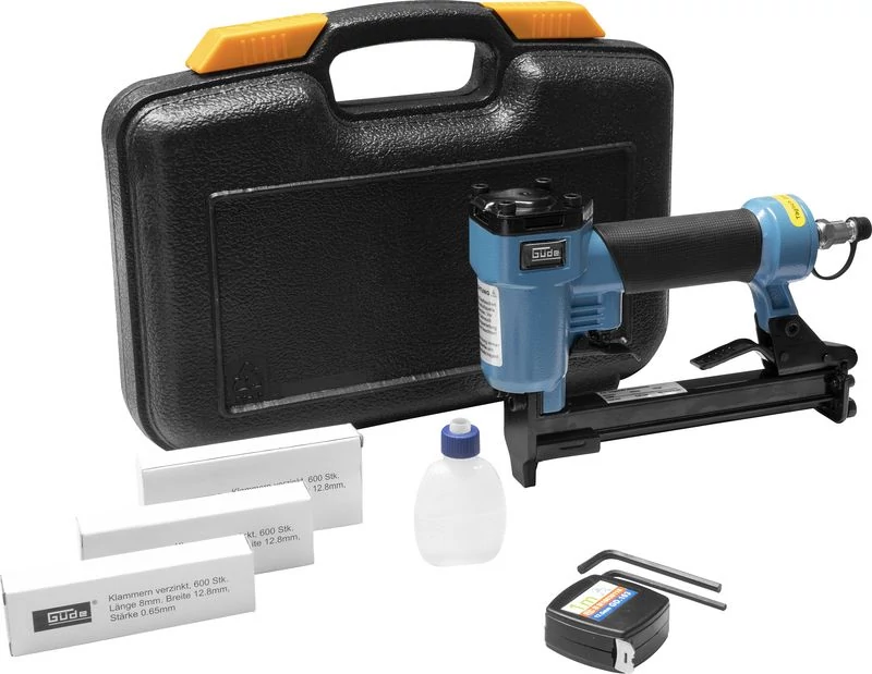 - A Güde KN 14 pneumatikus tűzőgép egy átfogó készletet tartalmaz, amely egy praktikus hordtáskában kerül forgalomba.