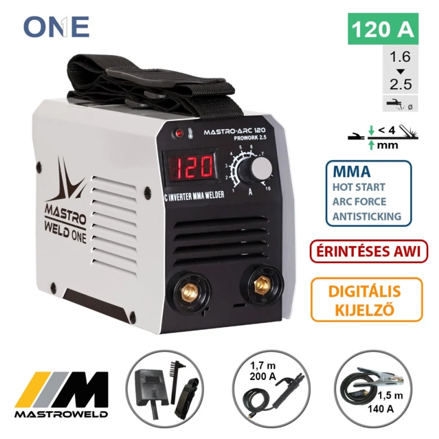 Bevontelektródás hegesztő inverter, érintéses AWI funkcióval, digitális kijelzővel, foganytúval és vállpánttal, bevontelektródás test és munkakábellel.