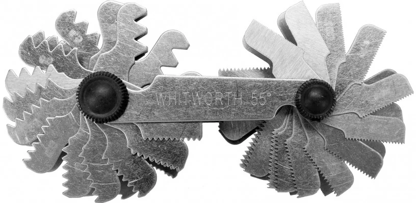 Edzett acéllemezből készült mérő. 52 csuklós lemeze van vágott menetmintákkal. 60°-os belső és külső metrikus menetekhez tervezve 0,25-6,0 mm-es osztásközzel és WHITWORTH 55°-os, 4-62 BSW-vel, a lemezek rögzítőcsavarral vannak rögzítve.