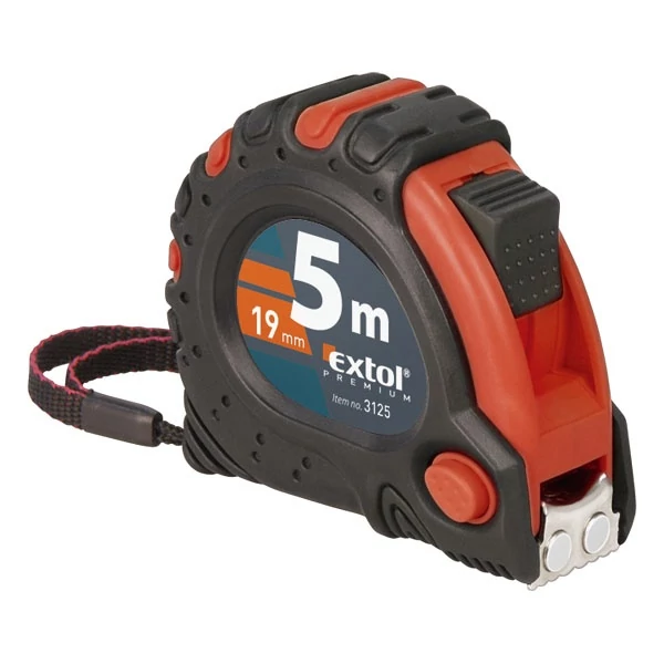 - A mérőszalag könnyű tartását az ergonomikus forma, a csúszásgátló elemek és a gumi borítás biztosítják. Ez utóbbi egyúttal a sérülés ellen is védi a testet.