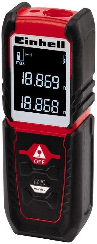 Az Einhell TC-LD 25 lézeres távolságmérő egy kisméretű, akár zsebben is hordható és könnyen kezelhető készülék, amely 25 méteres hatótávolságával egyszerű és pontos méréseket tesz lehetővé. A praktikus mérőeszköz segítségével pillanatok alatt megmérheti az egyes szakaszok hosszát, sőt, területet és térfogatot is számolhat vele. Nem számít, hogy újépítésű épületekben, tatarozási és felújítási munkákhoz, kertrendezéshez, vagy egyszerűen csak a műhelyben, egy munkadarab megmérésére szeretné használni a készüléket: a lézeres távolságmérő hasznos segítőtárs, legyen szó bármilyen mérésről. A referenciapontot a készülék elülső vagy hátsó éléhez tudja igazítani. A Min./Max. funkció segítségével tartós mérést is végezhet a készülékkel. A Softgrip felület tovább növeli a komfortérzetet, és még kényelmesebb munkavégzést biztosít. A felhasználó biztonsága érdekében a lézersugarat csak a BE/KI kapcsoló gomb kétszeri megnyomásával kapcsolhatja be. Ha nem használja a készüléket, akkor 3 perc után automatikusan kikapcsol. A lézeres távolságmérőhöz mellékelünk egy praktikus táskát is.