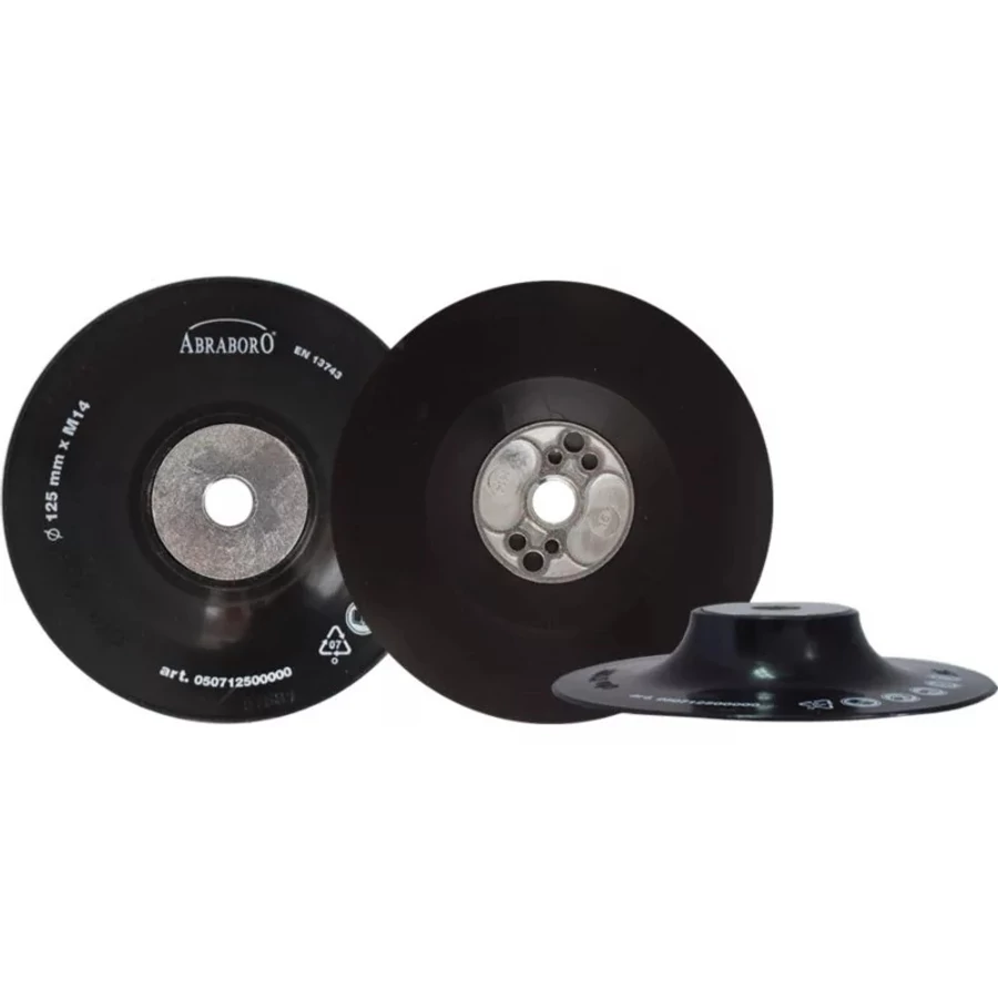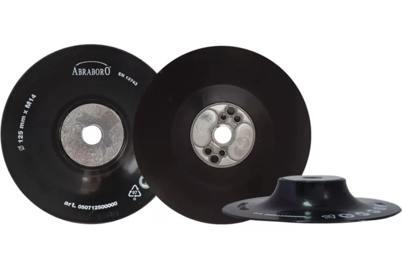 - Fibertárcsa felfogatásához alkalmas gumitányér. A szabvány M14-es menet segítségével felfogatjuk a gumitányért bármely sarokcsiszolóra. Ezt követően a fibertárcsát a leszorító anyával a gumitányérhoz rögzítjük. Csiszolólap csere esetén meg kell lazítani a szorítóanyát, majd kicserélni a csiszoló fibertárcsát.