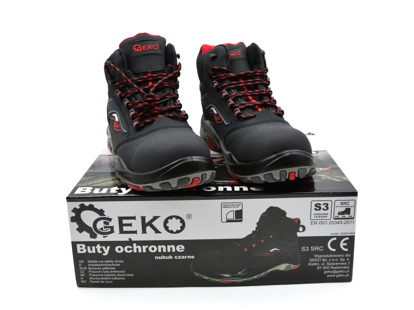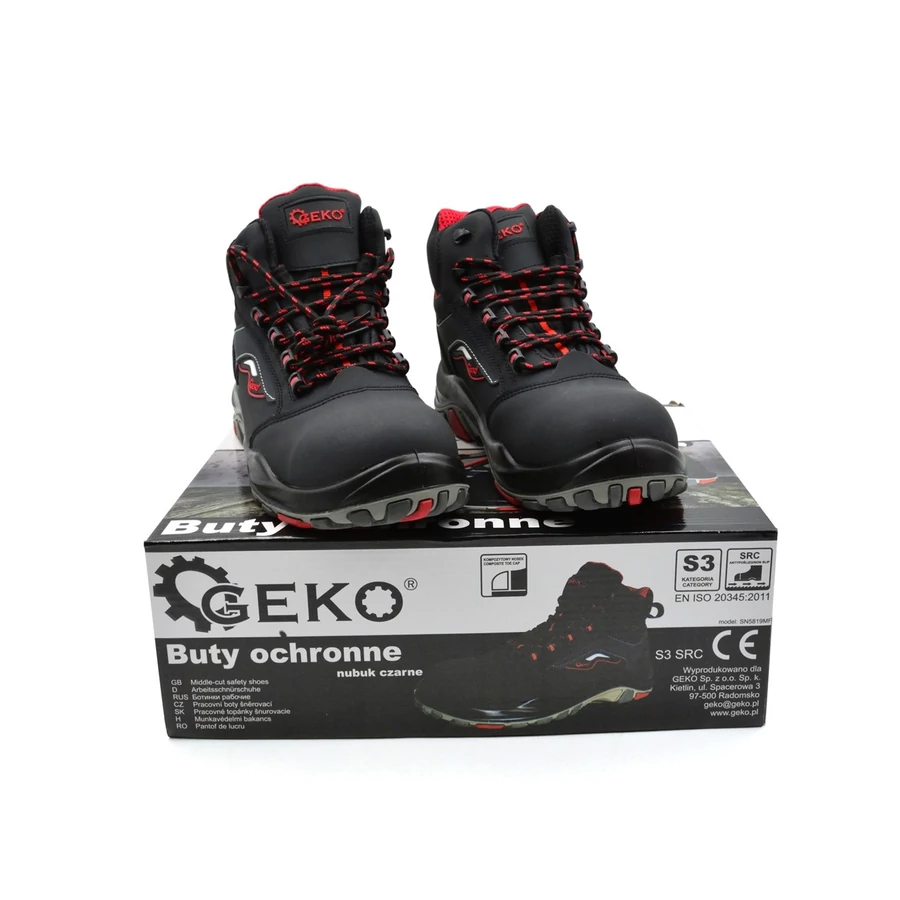 Kiváló minőségű, funkcionális Prémium bőr munkacipő, S3 SRC osztály. A neves GEKO márka cipői úgy lettek kialakítva, hogy megvédjék a lábat a külső tényezőktől, és úgy tervezték, hogy javítsák a munka kényelmét és biztonságát. A biztonságos lábbelikre vonatkozó követelményeket előíró szabványnak megfelelő lábbelik.