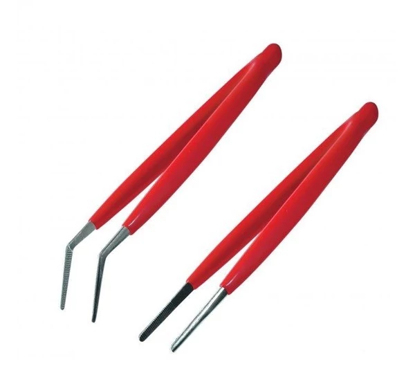 A műszerész csipesz készlet egy egyenes és egy 45°-ban hajlított csipeszből áll, közös jellemzőjük a jó fogású szigetelő bevonat recés fogófelület