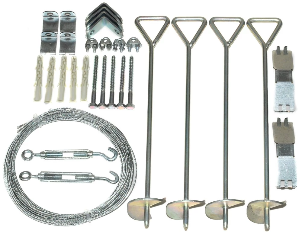 - A rögzítő rendszer szett minden olyan tartozékot tartalmaz, amely szükséges az üvegháznak a stabil alaphoz, vagy közvetlenül a földbe történő rögzítéséhez.