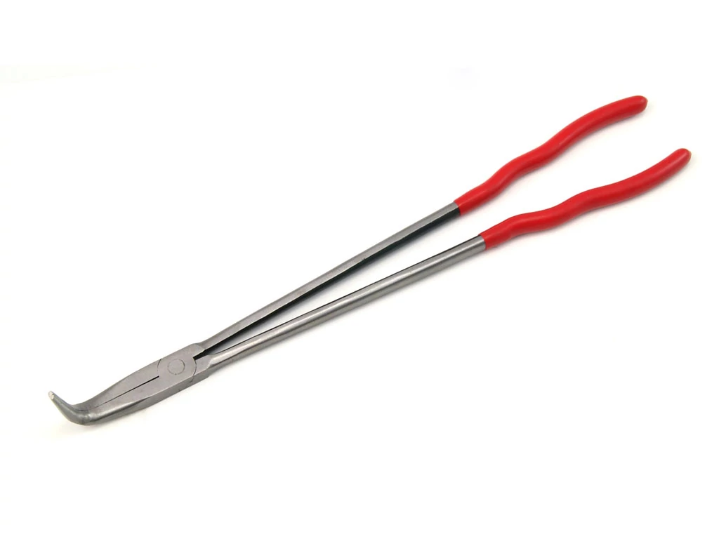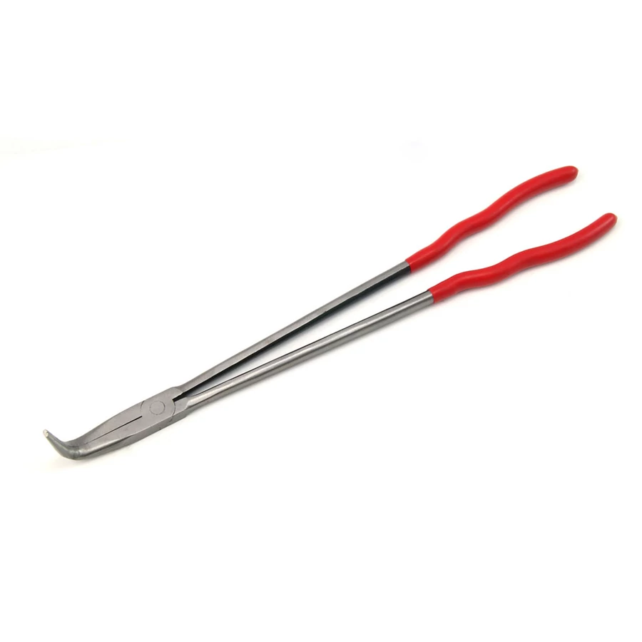 400 mm hosszú laposfogó, 90°-kal hajlított, rovátkolt félkerek pofákkal. Erős strapabíró ergonómikus gumírozott markolattal. Ideális huzalokkal szűk, távolabbi, nehezen hozzáférhető helyen végzett műveletekhez, csatlakozók szereléséhez. Összeillesztés: átlapolt