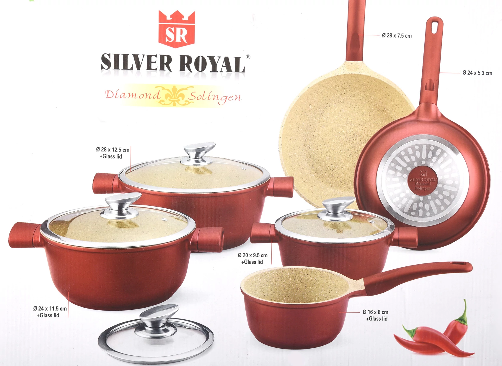 Mindig vágytál egy erős, megbízható edényre? Most egy teljes családot ajánlunk, amelyben a főzéshez szükséges különböző méretű edény választékot fellelheted. A gyönyörű vöröses barna külső megjelenés varázslatos eleganciát ad a Diamond gránit bevonatos edény családnak. Mindig öröm lesz ránézni, boldogan tálalhatod az elkészült ételeket a bio kerámia edényekben.Rendkívül kemény bevonat- karcálló- egészséges főzés olaj vagy zsír nélkül- kiváló minőségű alumínium test- gyorsan felmelegszik, és meleg marad az edény- ergonomikus bakelit fogantyú nem melegszik- egyszerűen mosogatható (mosogatógépben is)- használható gáz, elektromos, indukciós és kerámia főzőlapon.