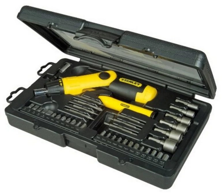 Racsnis csavarhúzó, rotáció irányváltó kapcsolóval. Hajlítható nyelű markolat, 45° és 90° -ban.Pl: 5; 6; 7 mm. Kétoldalú bitfej: lapos1,4&2; 2,4&3mm Ph00&PH00; Ph0&Ph1. Ph: 1; 2(2db) 3. Pz: 1; 2. Torx: 10; 15; 20; 25; 27; 30. Hex: 2; 3, 4; 5; 6 mm. SQ1; SQ2; SQ3. Dugókulcs: 6; 7; 8; 9; 10; 11 mm. Csavarhúzó markolat.