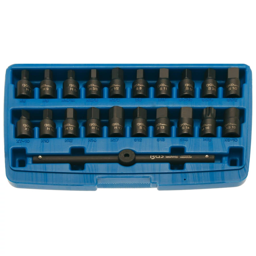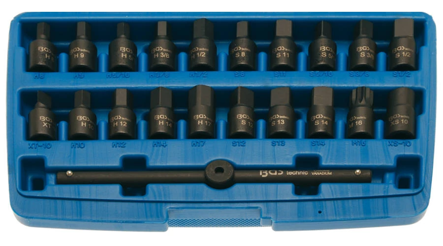 - 9 db hatlapú foglalat 8 - 9 - 10 - 12 - 14 - 17 mm, 8 mm (5/16 ") - 10 mm (3/8") - 12,5 mm (1/2 ")
