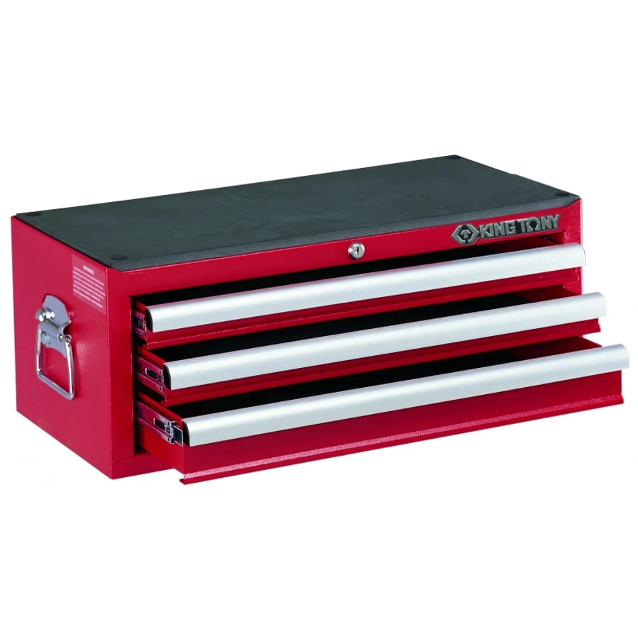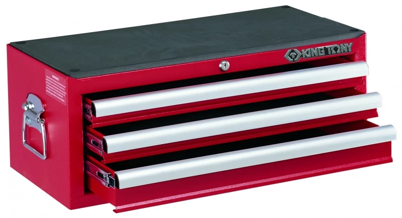 A King Tony szerszámos szekrény erős acéllemezből készült. A három fiók elegendő helyet biztosít számos szerszám kényelmes és átlátható tárolására. A központi záras megoldással egyszerre zárhatóak a csapágyazott fiókok. A két oldalon az egyszerű mozgatás véget, erős, strapabíró fogantyúkat rögzítettek. A külső borítása kiváló kémiai ellenállást biztosító porfestékkel van kezelve. A szerszámos szekrény teteje barázdált gumilappal van bevonva.