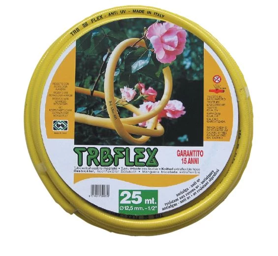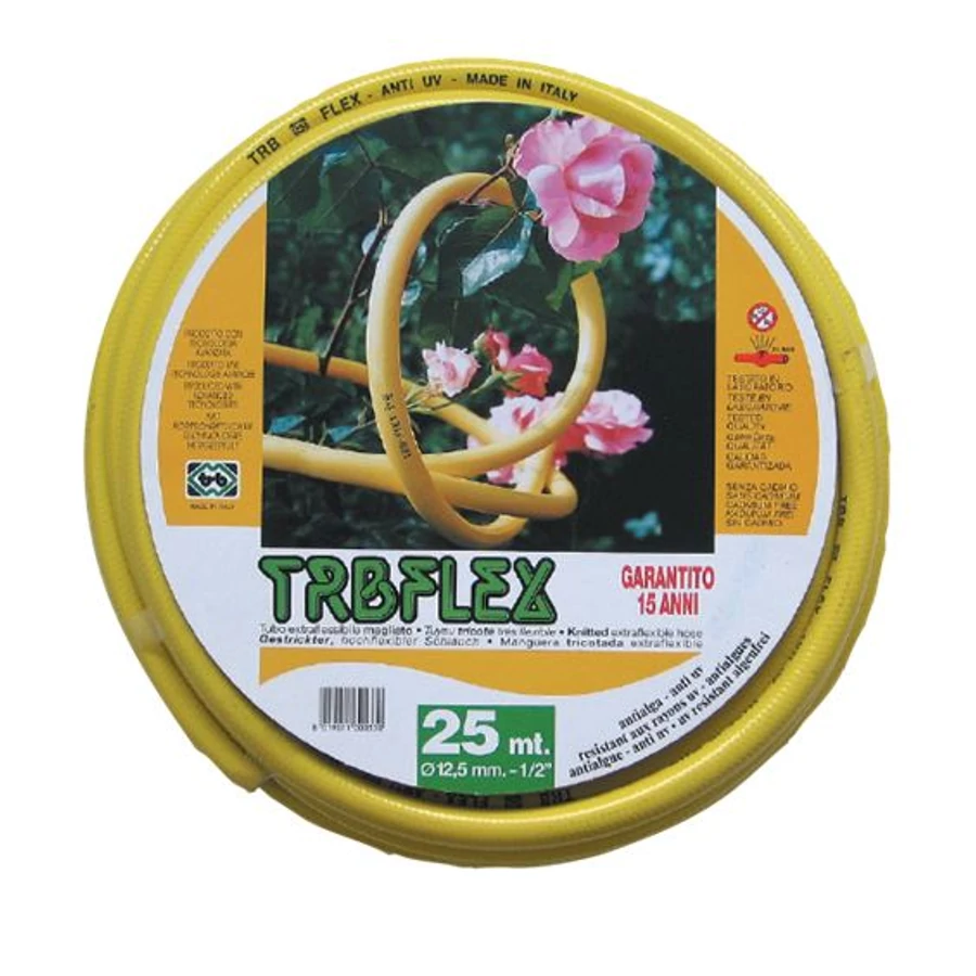 TRB-FLEX erősített (törés ellen) vászonbetétes olasz gyártású locsolócső. A slag rugalmas és lágy, erős textilszál gátolja a tömlőtörést, magas szakítószilárdságú poliészter bevonattal van kezelve. Használható kert öntözésére. A locsolótömlő 3 rétegű és szövetbetétes, magas UV ellenállással. A locsolótömlő szerelvényezhető tömlőcsatlakozókkal.