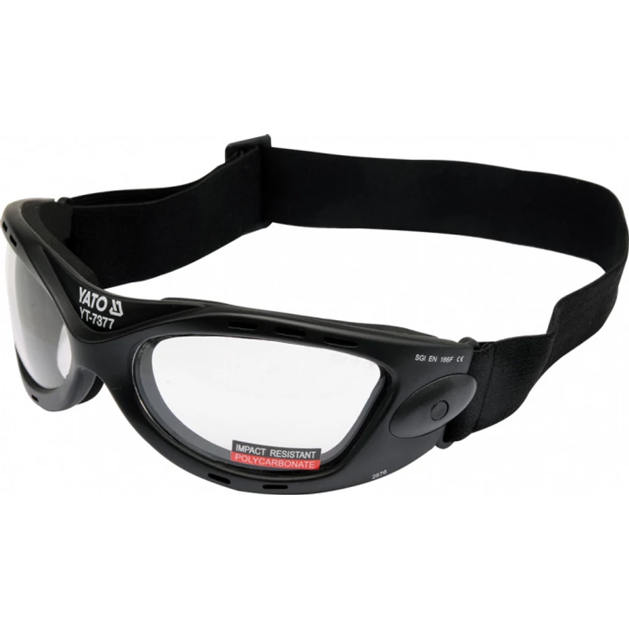 A szemüvegre emlékeztető vázszerkezetű YT-7377 védőszemüveg tökéletesen illeszkedik az arcra, a szemüveg nem csak elölről, hanem szinte minden oldalról védi a szemet, ezért poros körülmények között végzett munkához (pl. gitt kézi csiszolása) ajánlott. és olyan helyzetekben, amikor nem tudjuk megjósolni a feldolgozott anyagromlás irányát (pl. favágás szúrófűrésszel vagy rókafarkú eszközzel).